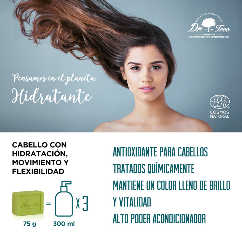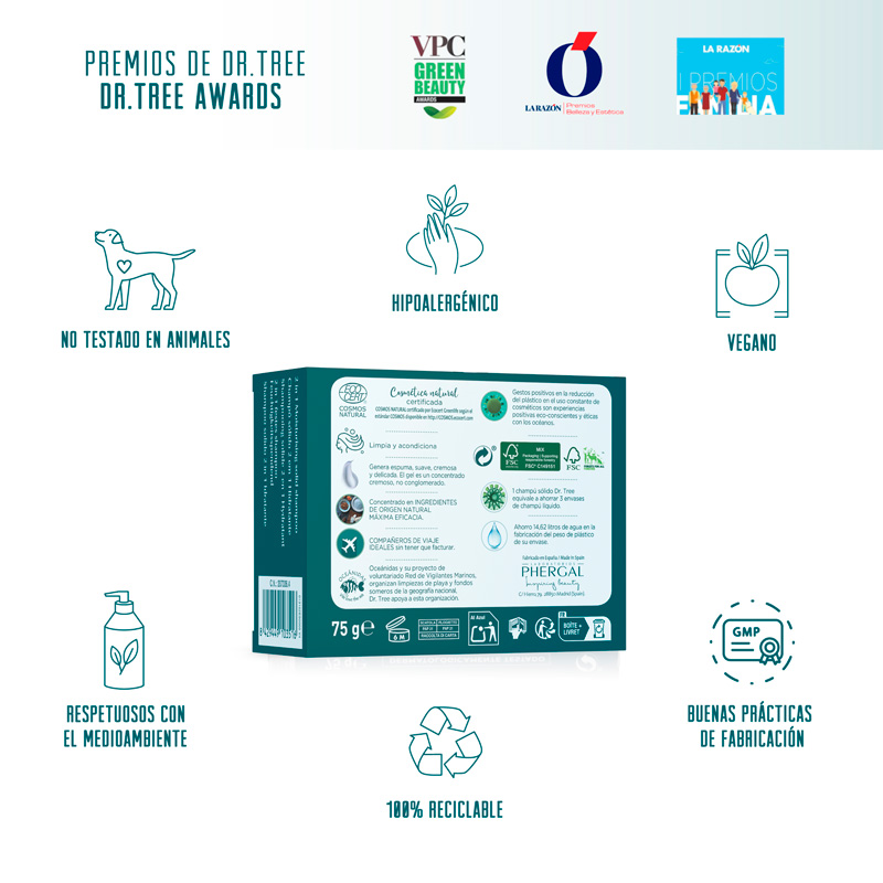 El champú sólido natural de Dr. Tree equivale a ahorrar 3 envases de champú líquido de 300 ml, lo que supone un ahorro de 14,62 L de agua en su fabricación y una gran ayuda frente a la contaminación por el excesivo uso de plásticos.