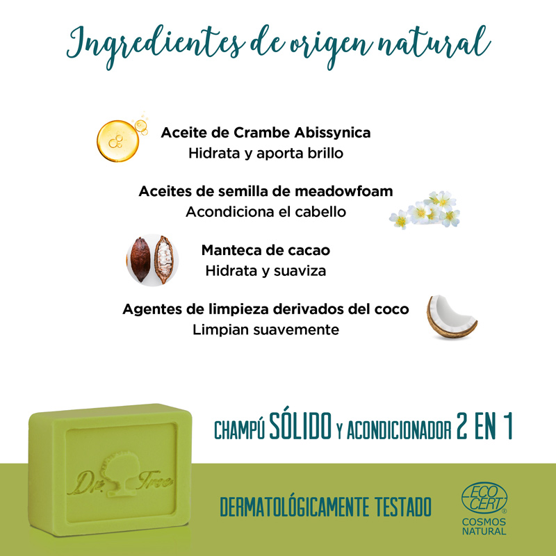 Súmate a la moda de los champús sólidos de Dr Tree, con certificación Ecocert COSMOS Natural que garantiza un mínimo de 99% de ingredientes naturales.