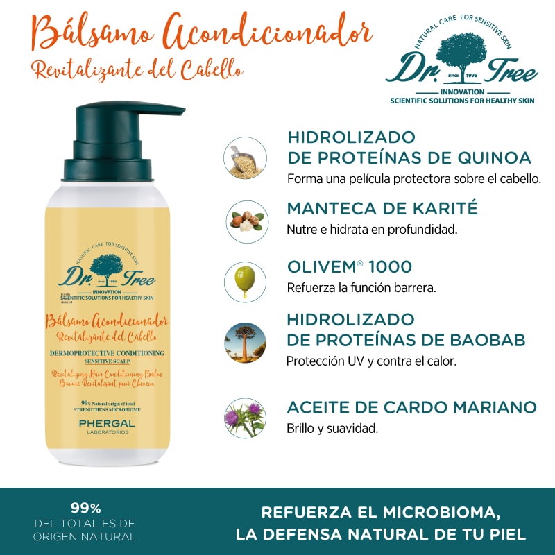 Alrededor del 60% de las mujeres y el 40% de los hombres presentan cueros cabelludos sensibles y sus causas pueden variar considerablemente. La exposición a ciertas condiciones climáticas, la contaminación o el estrés pueden hacer que experimente sensibilidad en la zona del cuero cabelludo. Los síntomas más frecuentes son, ardor, hormigueo, dolor, picor y enrojecimiento. Nuestro cabello necesita cuidados específicos diarios, y por ello es imprescindible aportarle los mejores cuidados. El nuevo Bálsamo Acondicionador Capilar de Dr. Tree restaura la barrera cutánea a la vez que aporta fuerza y brillo.