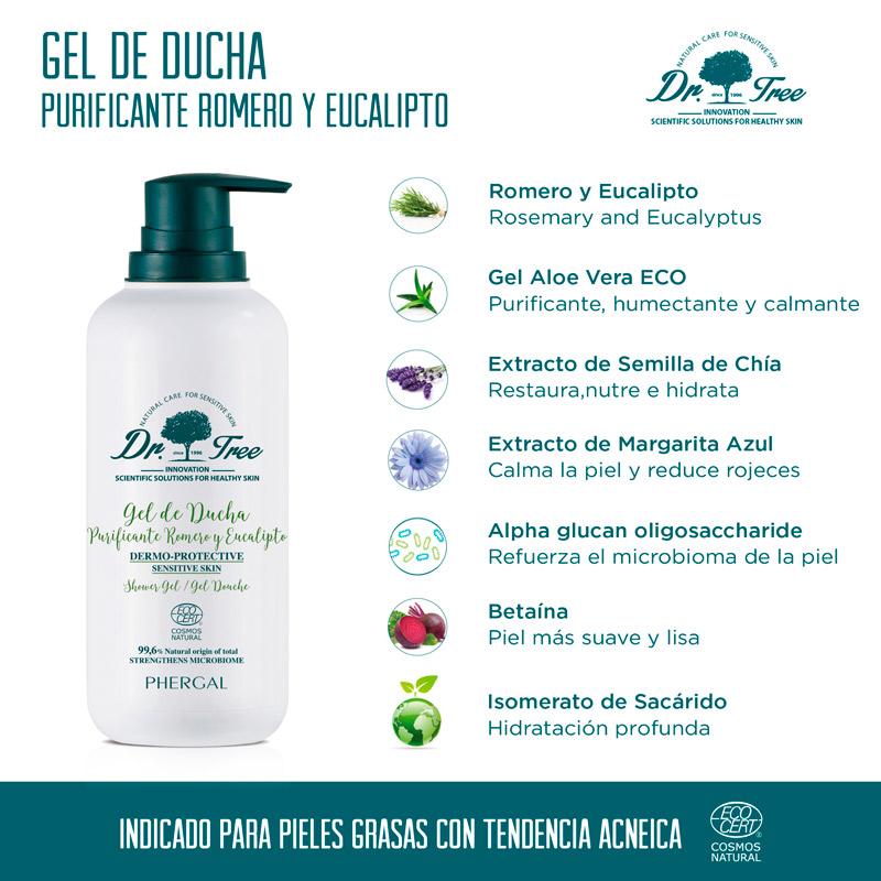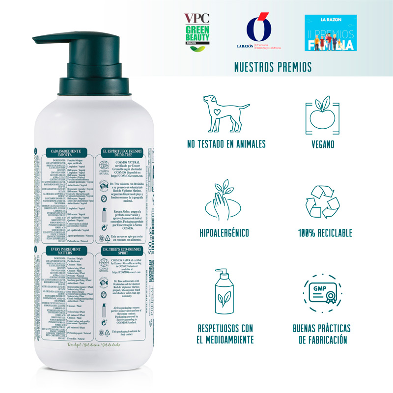 Estoy encantada con este gel de ducha y con la marca Dr Tree líder en la cosmética respetuosa con la piel y con el medio ambiente “clean beauty”.Tengo una piel bastante sensible, con periodos de urticaria y sequedad. Y con este gel noto bastante mejoría primero porque tras la ducha no noto la piel tirante y segundo porque la noto más suave. También es útil para pieles atópicas que con el cambio de estación siempre se acentúan. Tiene un aroma a eucalipto y romero, que me encanta.Viene en una bolsa protegido. M gusta que venga con dosificador.Cuando se me acabe el envase le quitaré la pegatina (fácilmente) y lo reutilizaré.