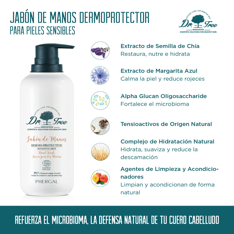 Contiene activos hidratantes y protectores que restauran la barrera cutánea aportando confort, mientras que los agentes de limpieza y acondicionadores aportan hidratación y suavidad, recuperando el ecosistema natural. Además el jabón natural para manos de Dr Tree cuenta con la certificación ECOCERT Cosmos Natural que garantiza que el 99,7% de Ingredientes son de origen natural.